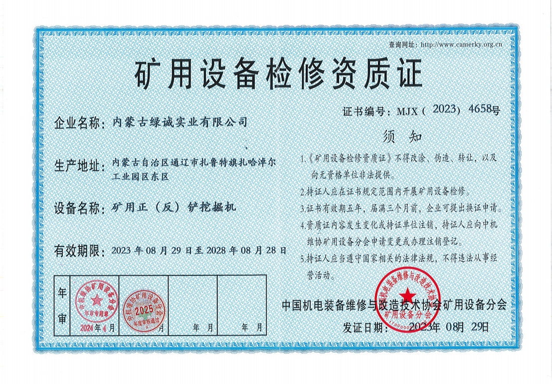 2018年我公司通過中國機電裝備維修與改造技術協會礦用設備分會審核并取得了9項礦用設備檢修資質證書。公司本著“誠信為本 質量為先 全心全意為客戶 ”的服務理念,圓滿完成各個廠礦的機械維修及配套服務,期待與您共同合作。